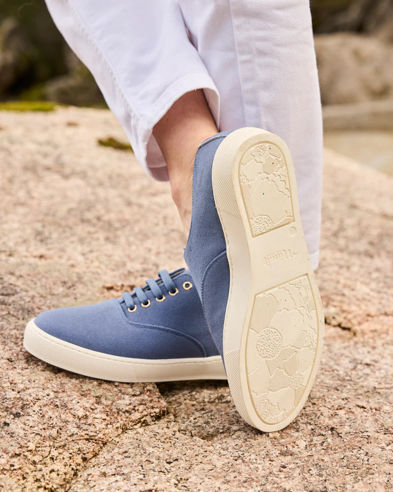 Tous nos modèles sont fabriqués au Portugal dans des ateliers familiaux avec qui nous travaillons depuis nos débuts en 2017. Nous avons fait le choix de bannir le cuir animal et les matières toxiques, sans compromis sur la qualité. Nos semelles, doublures et lacets sont recyclés, tout comme les matières principales, qui intègrent des fibres végétales.